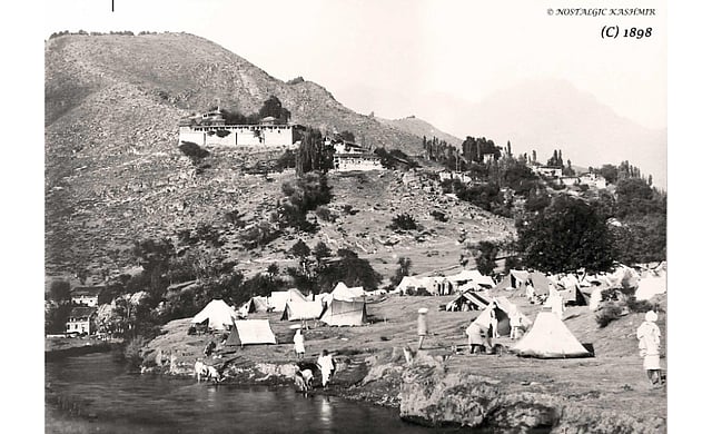 Photograph taken by Dewan Alam Chand in 1898 showing the Yatra Camp along the Babal Canal beneath the Shrine at Aishmuqam, Anantnag, South Kashmir.