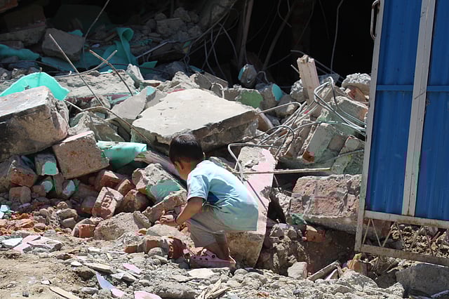 Amid the rubble, a young boy sifts through the debris, searching desperately for his lost schoolbook in village Murran of Pulwama district of Kashmir. KT Photo