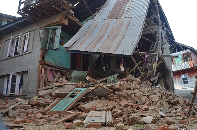 Rubble falling from the rooftop of the demolished home of Shahzada Bano in South Kashmir's Bijbehara. Photo/Haseeb Ibn Hameed