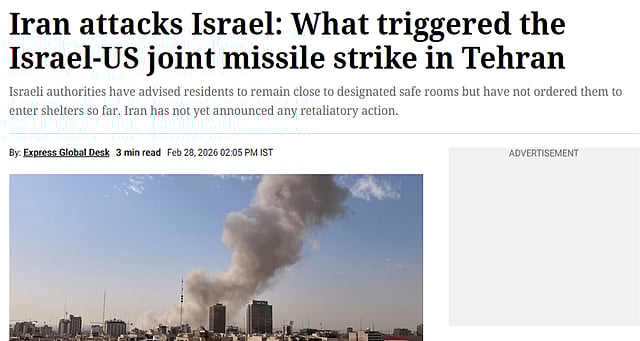 The February 28 report's own subheading quietly contradicted its headline. “Israeli authorities have advised the residents to remain close to designated rooms but have not ordered them to enter shelters so far. Iran has not yet announced any retaliatory action”. While the Indian Express story states that Iran has not started retaliation, the headline says, "Iran attacks Israel".