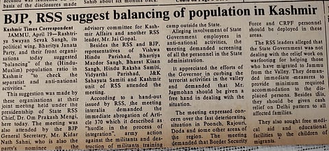 JAMMU, April 19: Rashtriya Swayam Sevak Sangh, its political wing, Bharatiya Janata Party and their front organizations today suggested “balancing” of the (Hindu-Muslim) population ratio in Kashmir “to check the separatist and anti-national activities.”