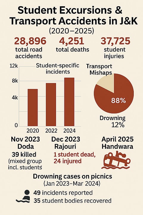 This is not an isolated case. According to data collated through RTI responses and Traffic Department, in the past five years, Jammu and Kashmir has witnessed 28,896 road accidents, resulting in 4,251 deaths and 37,725 injuries. Several of these incidents involved student transportation. In November 2023, 39 people, including several students, died when a bus plunged into a gorge in Doda. In December 2023, a student was killed and 24 injured when a minibus overturned in Rajouri.