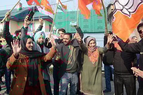 Bhartiya Janata Party workers celebrates party victory in three states’ elections in Srinagar on Monday, December 04, 2023. KT Photo/Qazi Irshad