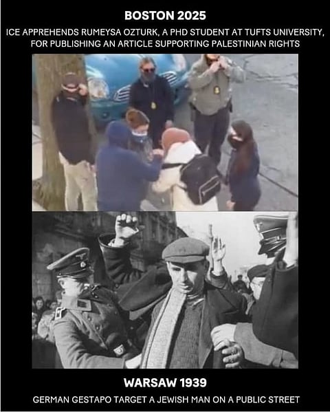 Rümeysa was detained with no evidence or explanation, by masked men and women, allegedly cops without uniforms, badges or identity cards, in a Boston-area suburb, in front of her shocked neighbourhood, while the footage of this sinister act went viral. A Fulbright PhD scholar, with a legitimate visa, she is being threatened to be packed off to Turkey. Indeed, even her initial whereabouts were not known, not even to her lawyers and relatives.